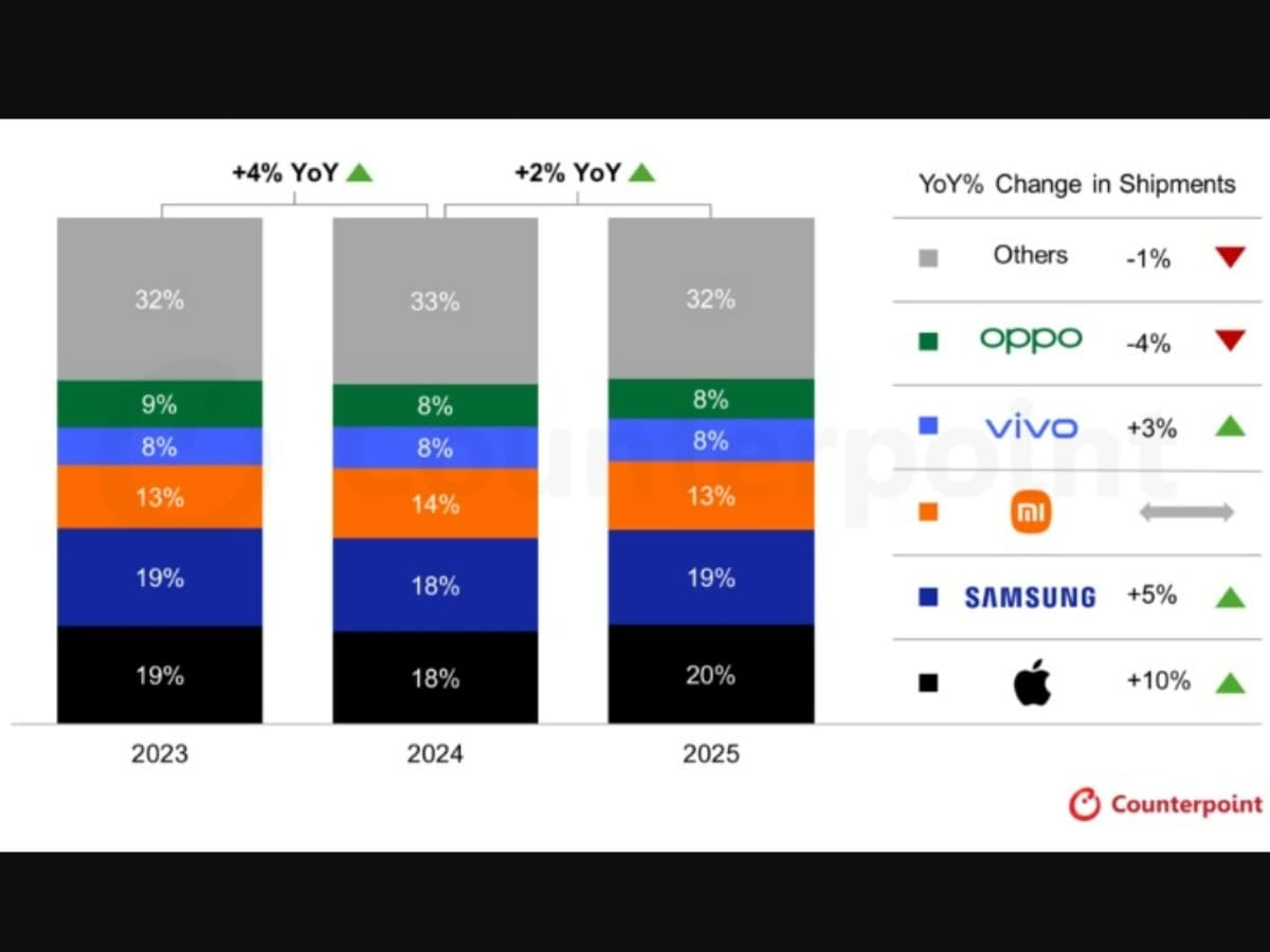 গত বছর গ্লোবাল স্মার্টফোন বাজারের ছবিটা বেশ পরিষ্কার ছিল। সবাইকে পিছনে ফেলে শীর্ষে ছিল Apple। কাউন্টারপয়েন্ট রিসার্চের সাম্প্রতিক তথ্য বলছে, ২০২৫ সালে বিশ্বজুড়ে স্মার্টফোন শিপমেন্টের নিরিখে অ্যাপল সবার উপরে জায়গা করে নিয়েছে। বছরে ১০ শতাংশ বৃদ্ধির সাথে কোম্পানিটি গ্লোবাল বাজারের প্রায় ২০ শতাংশ দখলে রেখেছে।
